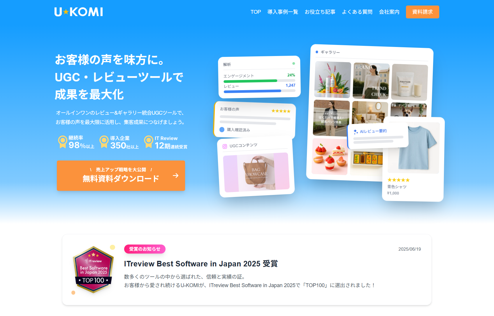 U-KOMI(ユー・コミ)は、UGCレビューツール分野での導入数日本一(※タグ検知クローラー回遊による、実態調査調べ)を誇るツールです。通常のサイトでわずか1〜2%のレビュー獲得率を、10%前後まで引き上げた事例も少なくありません。